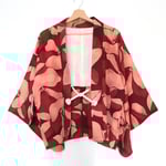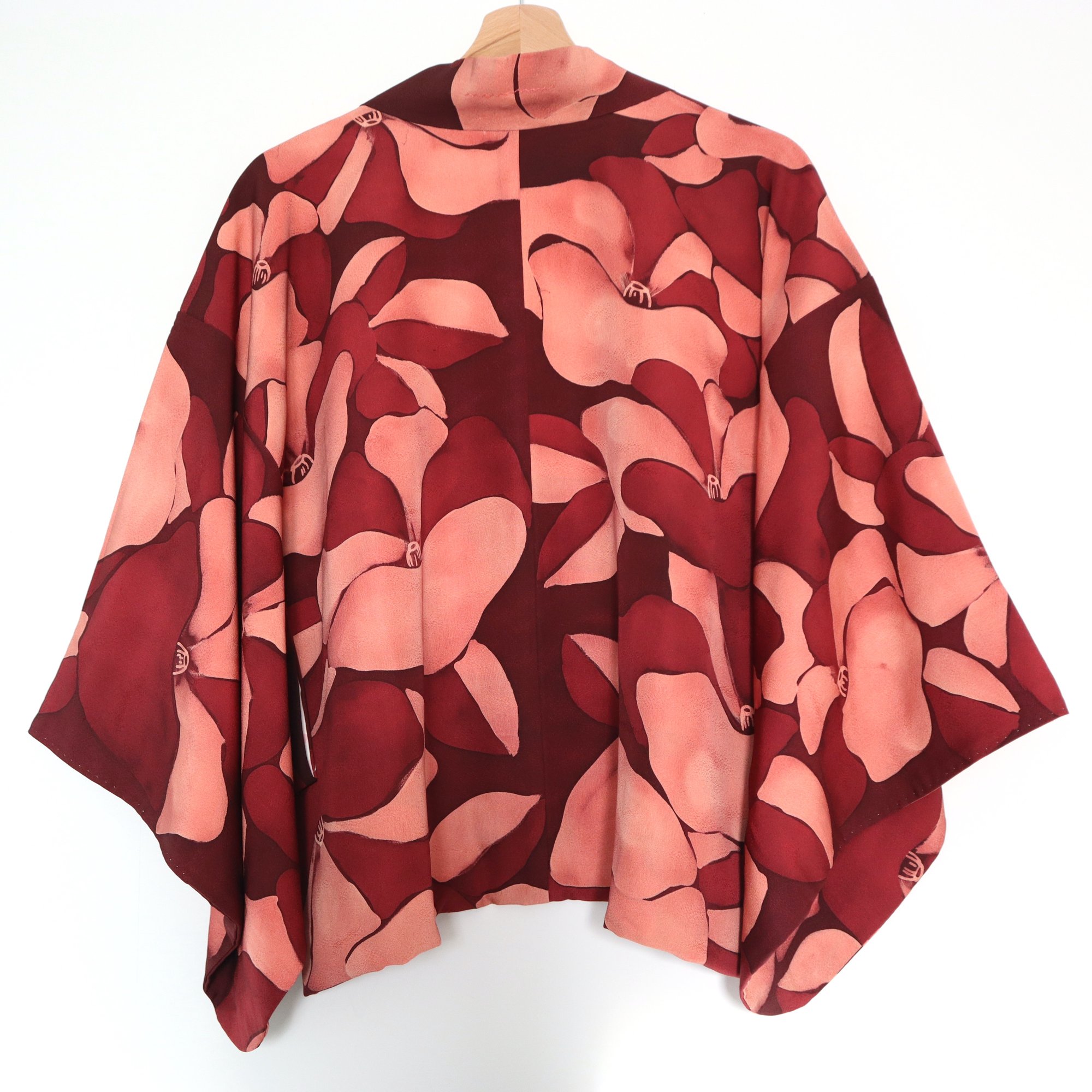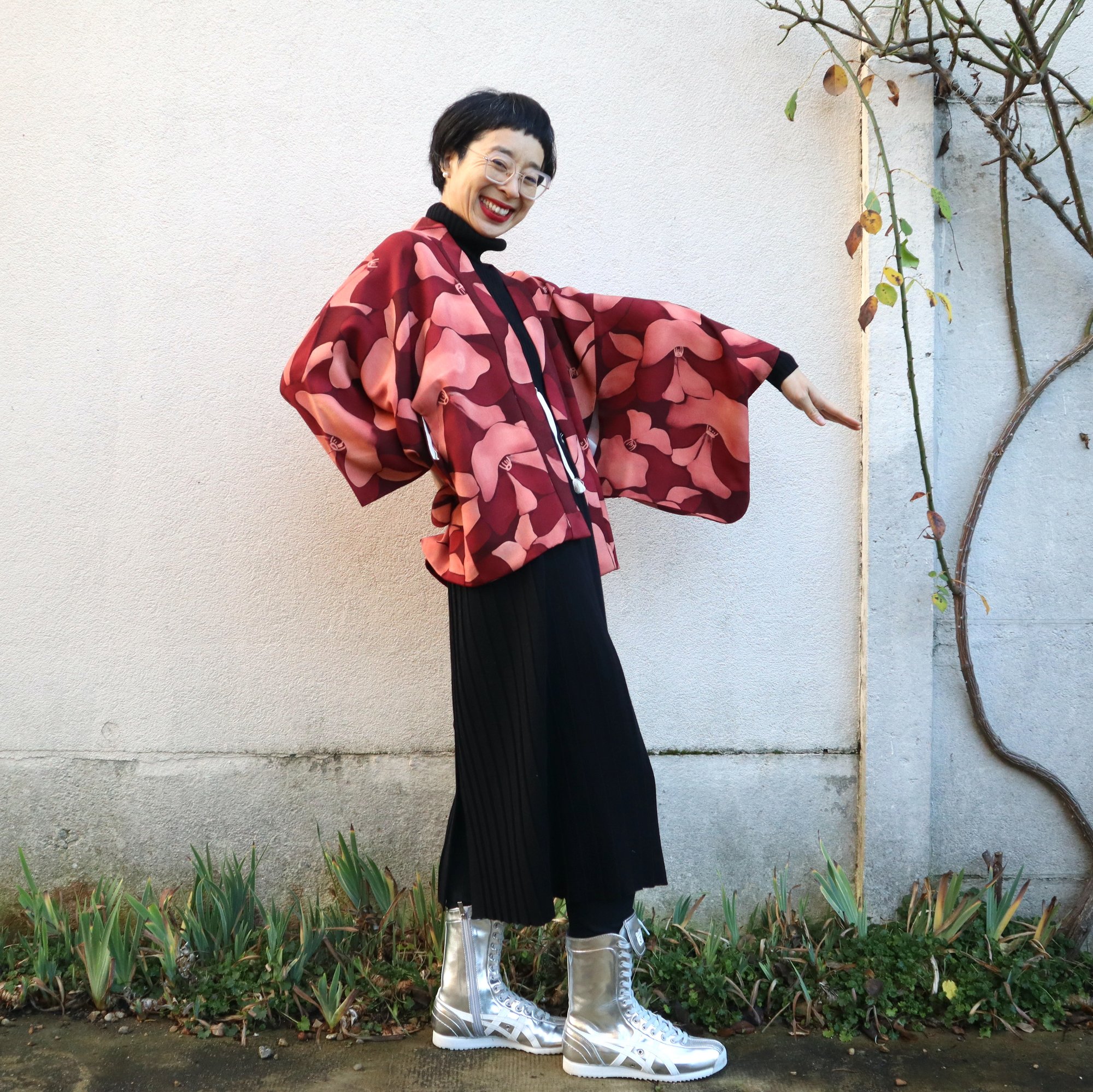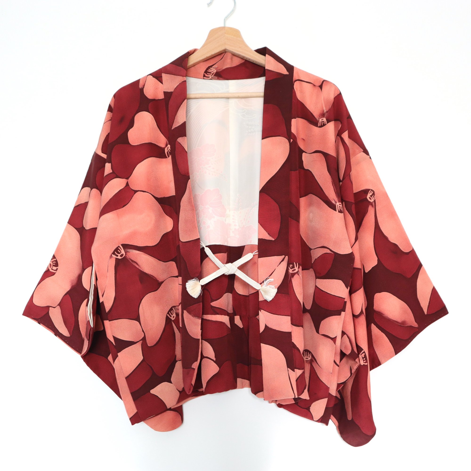 HAORI court, c'est une veste faite avec un HAORI (manteau pour KIMONO) ancien. Vous pouvez le porter à la maison comme gilet ou comme manteau pour sortir. Et, comme il n'est pas coupé, il est possible de le faire revenir en manteau traditionnel si vous le souhaitez un jour.