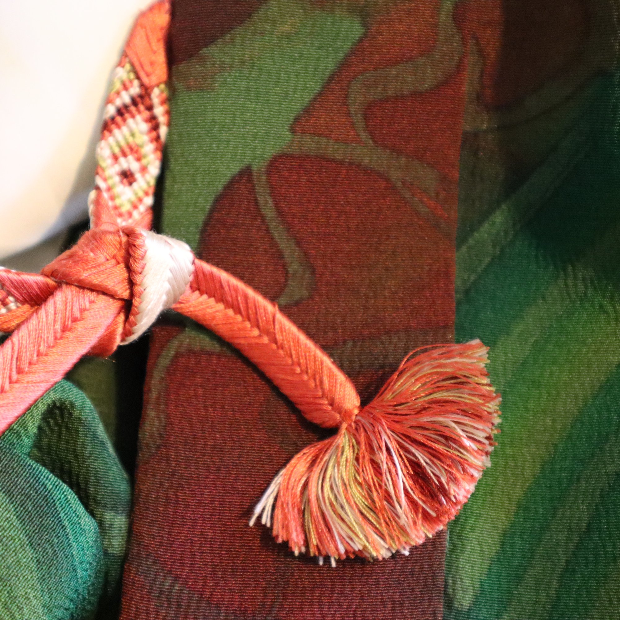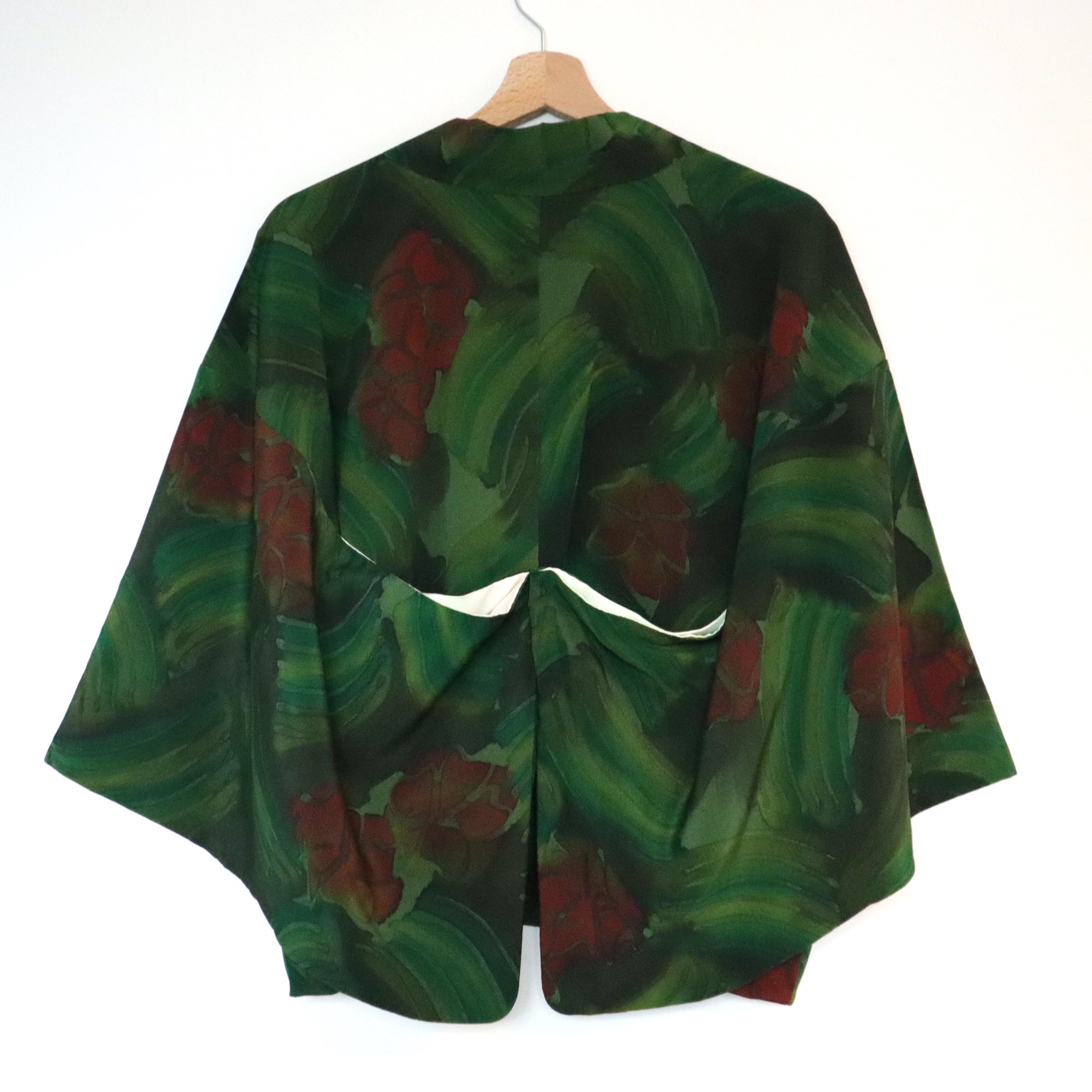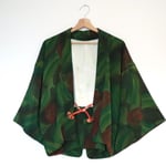 HAORI court, c'est une veste faite avec un HAORI (manteau pour KIMONO) ancien. Vous pouvez le porter à la maison comme gilet ou comme manteau pour sortir. Et, comme il n'est pas coupé, il est possible de le faire revenir en manteau traditionnel si vous le souhaitez un jour.