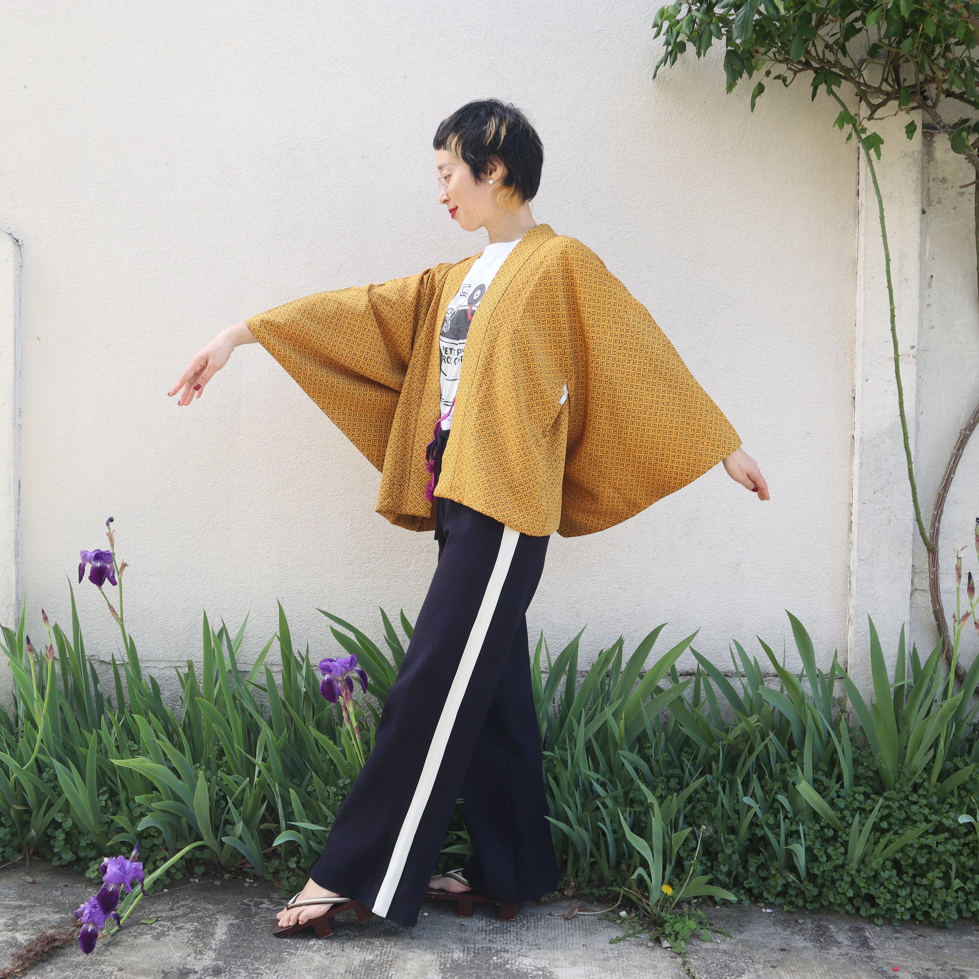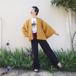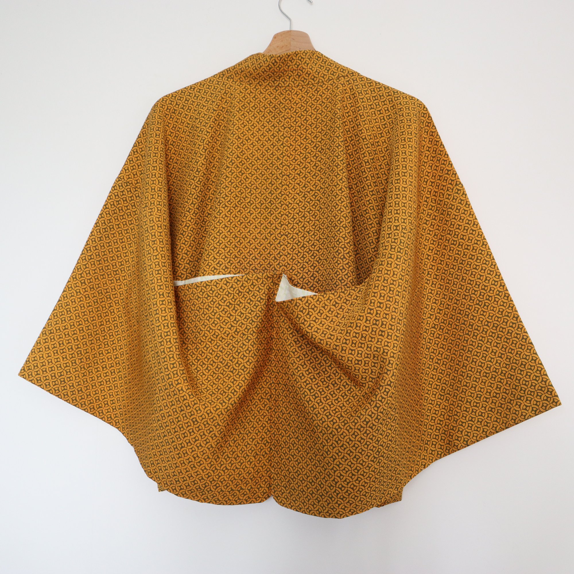 HAORI court, c'est une veste faite avec un HAORI (manteau pour KIMONO) ancien. Vous pouvez le porter à la maison comme gilet ou comme manteau pour sortir. Et, comme il n'est pas coupé, il est possible de le faire revenir en manteau traditionnel si vous le souhaitez un jour.