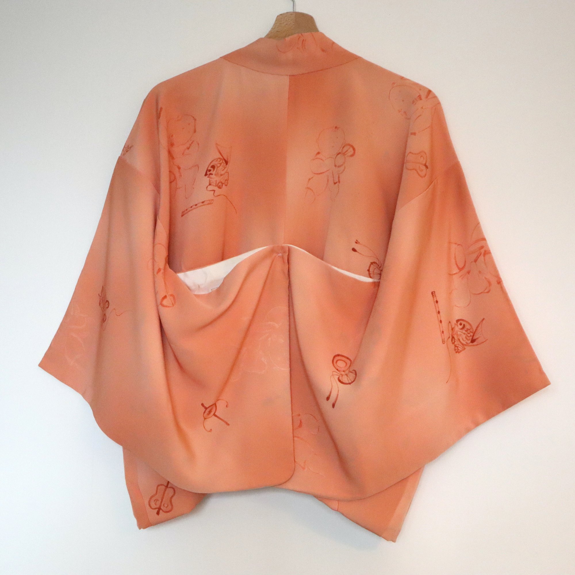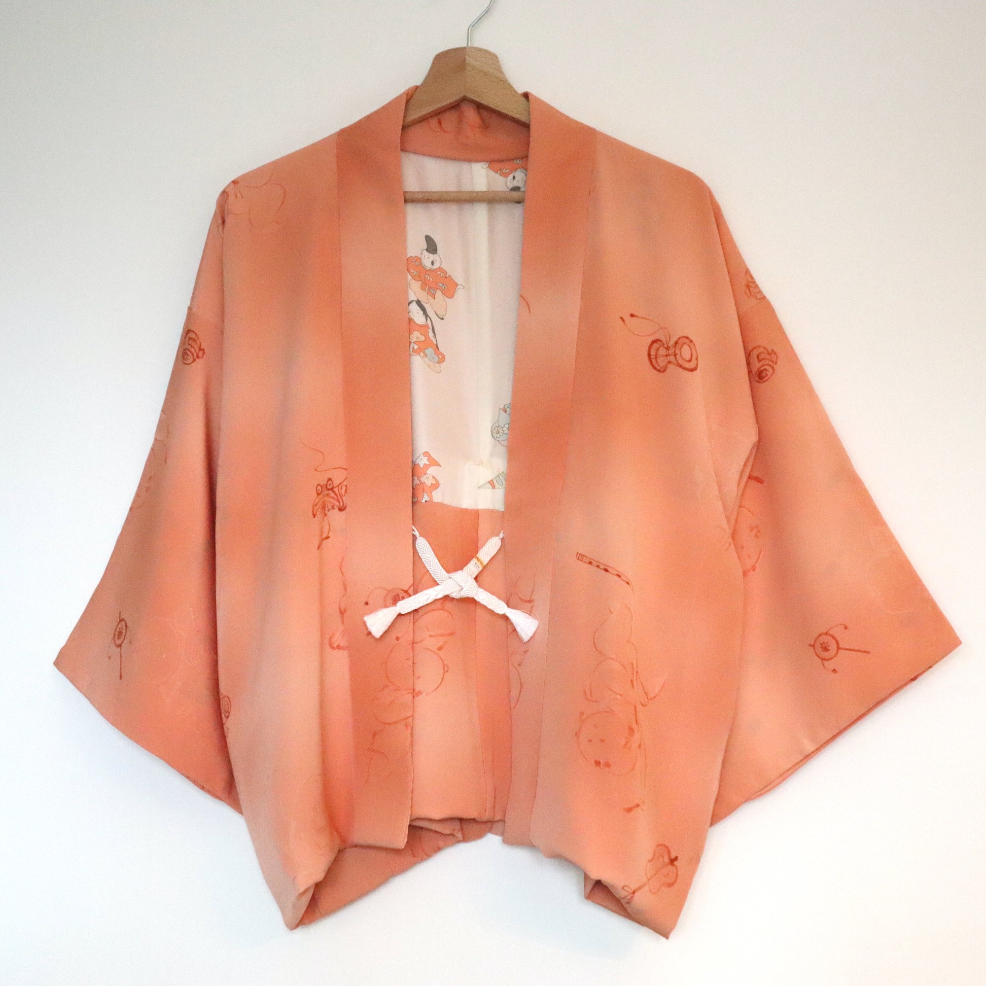 HAORI court, c'est une veste faite avec un HAORI (manteau pour KIMONO) ancien. Vous pouvez le porter à la maison comme gilet ou comme manteau pour sortir. Et, comme il n'est pas coupé, il est possible de le faire revenir en manteau traditionnel si vous le souhaitez un jour.