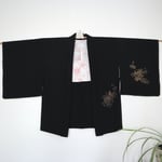 Ce kimono est une véritable œuvre d'art. Chaque feuille végétale a été délicatement peinte à la main avec une peinture dorée. Pour parfaire ce tableau, les fleurs sont sublimées par une broderie artisanale d'une finesse rare.