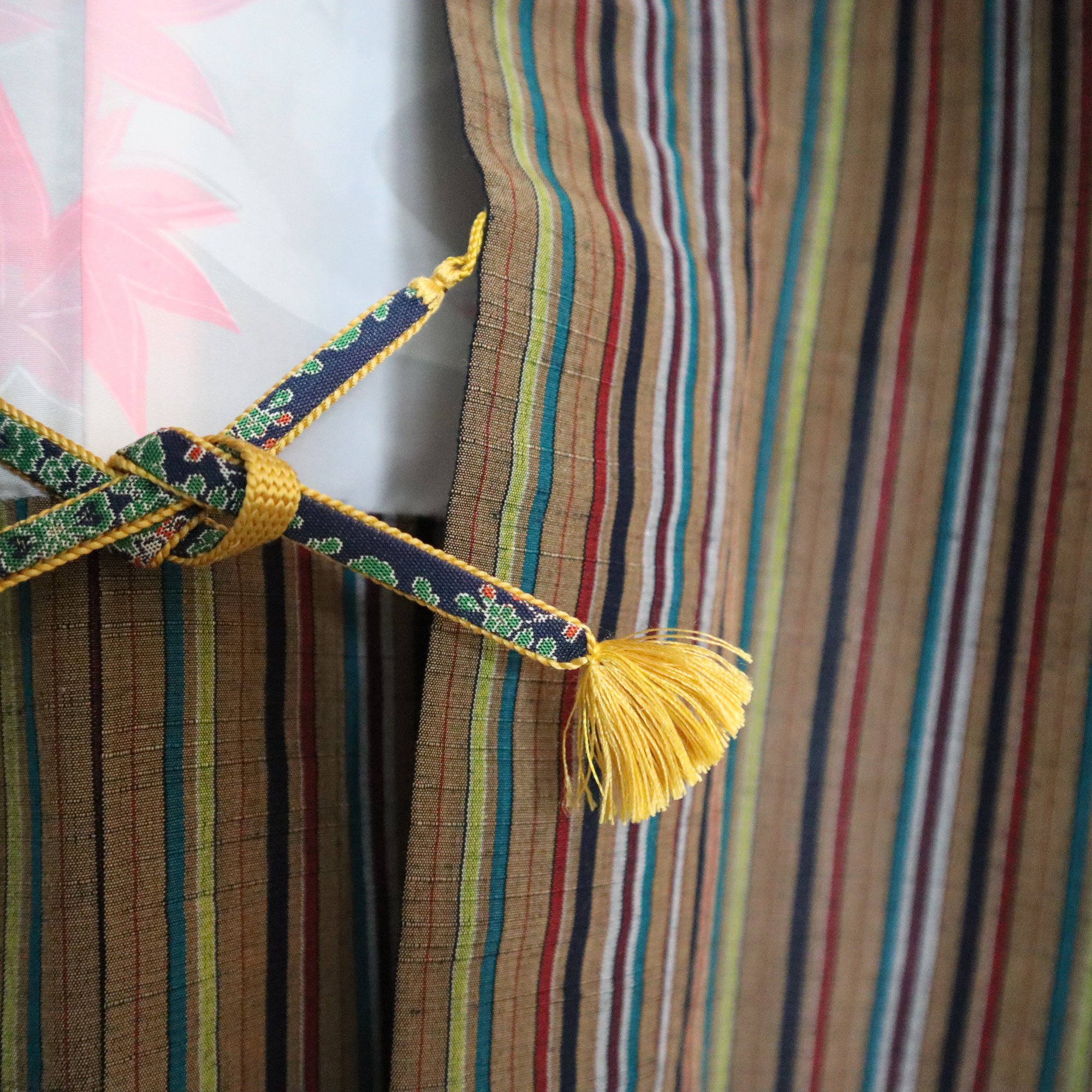 Tsumugi (紬) est un mot japonais qui désigne un tissu fabriqué avec des fibres de soie teintes spécialement pour créer des motifs et des images, comme l'IKAT (technique de teinture et de tissage utilisée en Indonésie). Ce tissu est léger et fin mais très solide. C'est un tissu très apprécié des Japonais depuis longtemps.